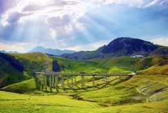 乘车途经壮观的【果子沟大桥】,大桥横跨【果子沟峡谷】,远观【果子沟】茂密的森林美景,【果子沟】是连接赛里木湖与伊犁河谷的著名峡谷孔道,沟内峰峦耸峙、飞瀑涌泉、果树丛生、野花竞放,以野果多而得名。