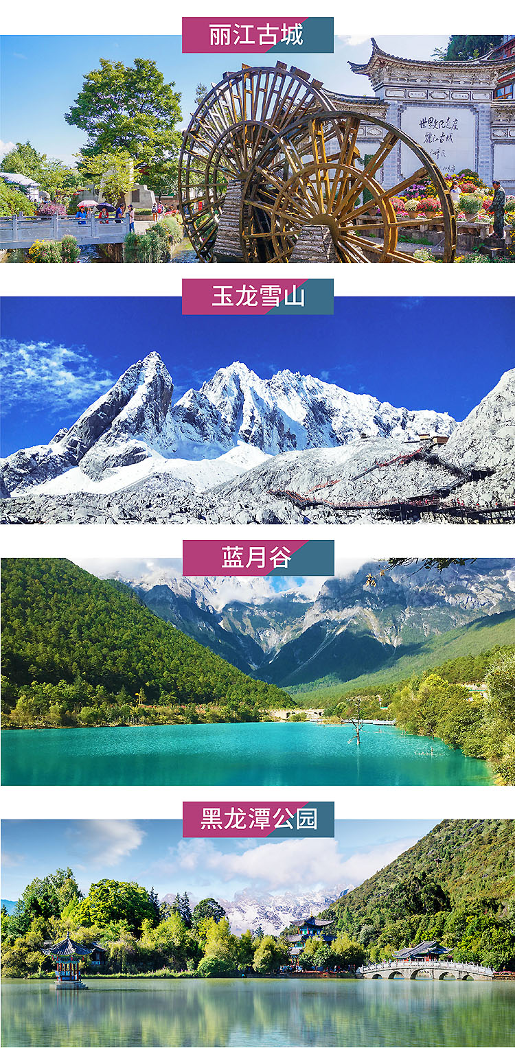玉龙雪山、冰川大索道、冰川公园→甘海子→蓝月谷→黑龙潭公园→丽江古城→宿丽江