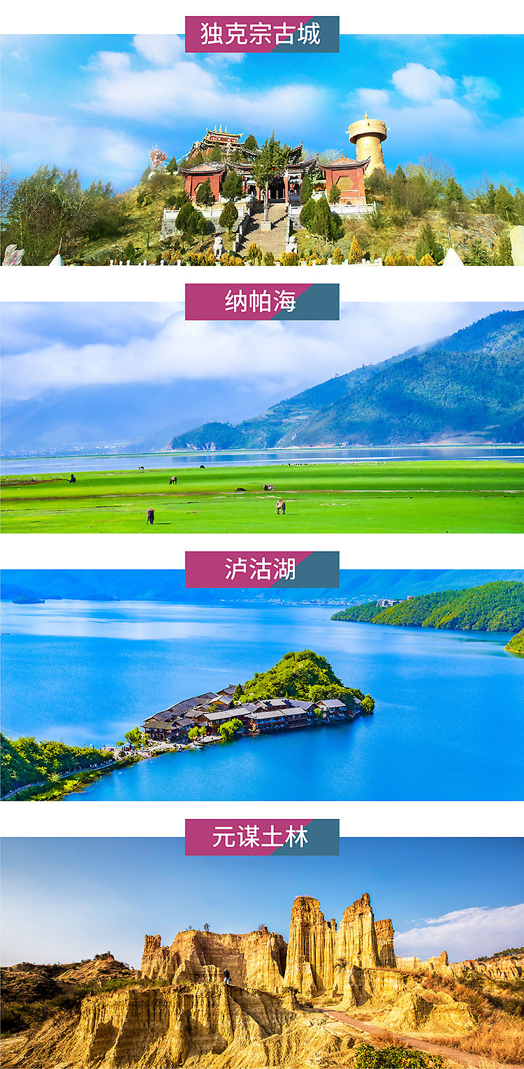 6、包含旅游内容:包含碧色寨、建水古城、石屏古城、哀牢山观景台、告庄西双景、西双版纳、原始森林公园、勐焕大金塔、勐焕银塔、腾冲热海、司莫拉佤族村、和顺古镇、大理古城与洋人街、洱海(喜洲古镇、洱海生态廊道S湾)、玉龙雪山(冰川公园、甘海子、蓝月谷)、黑龙潭公园、丽江古城、长江第一湾、普达措国家公园、独克宗古城、纳帕海与依拉草原、泸沽湖旅游。
